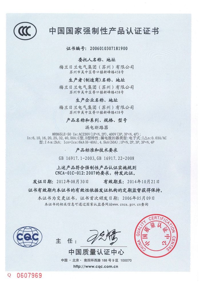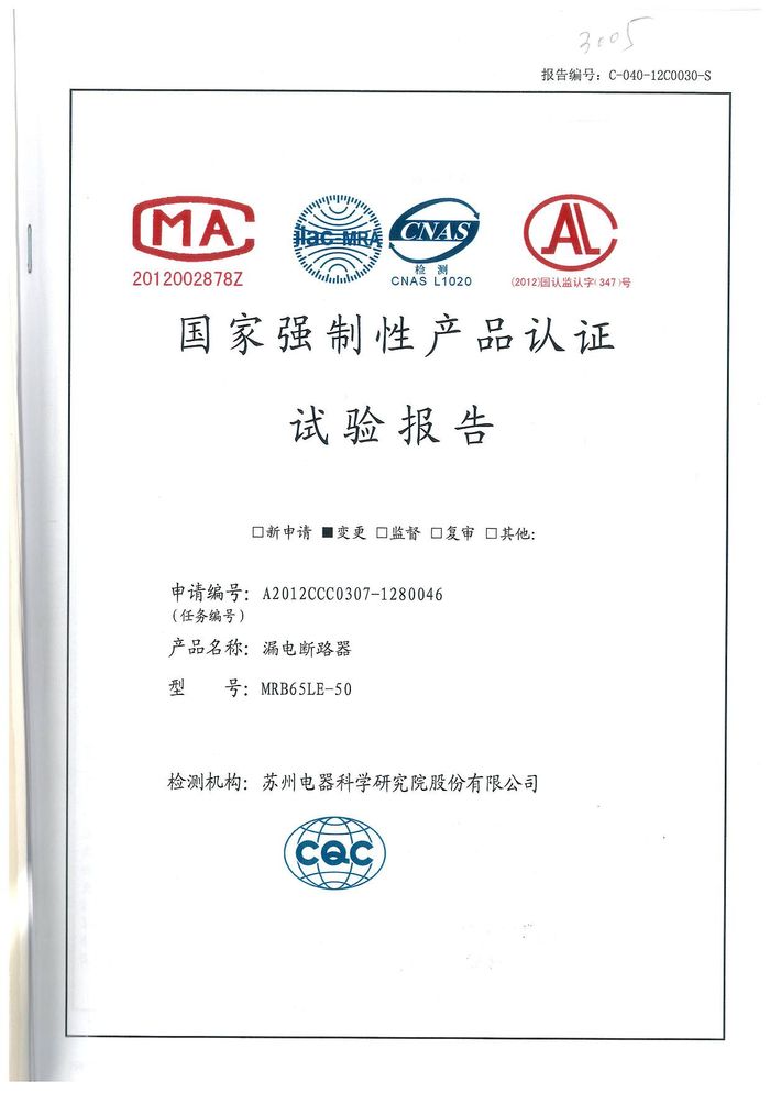 MRB65LE-50漏電斷路器資質證書