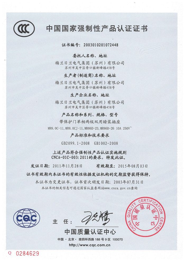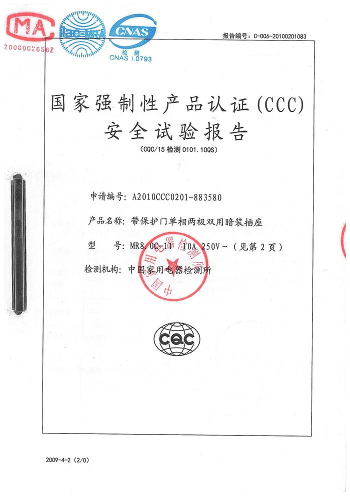 MR8.0C兩位、四位插座資質(zhì)證書(shū)