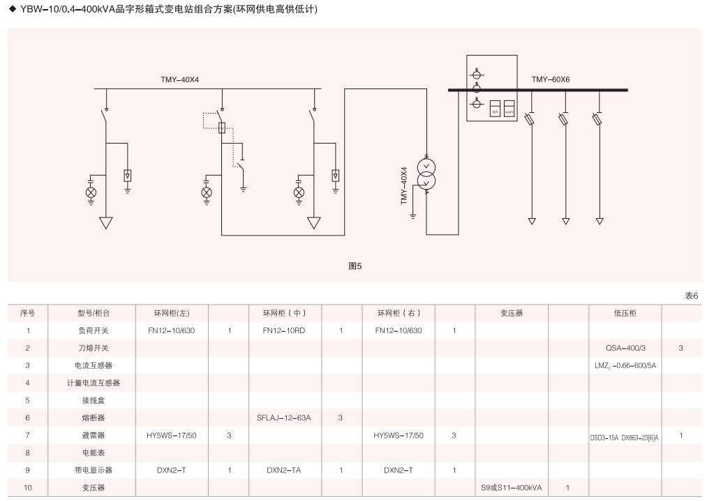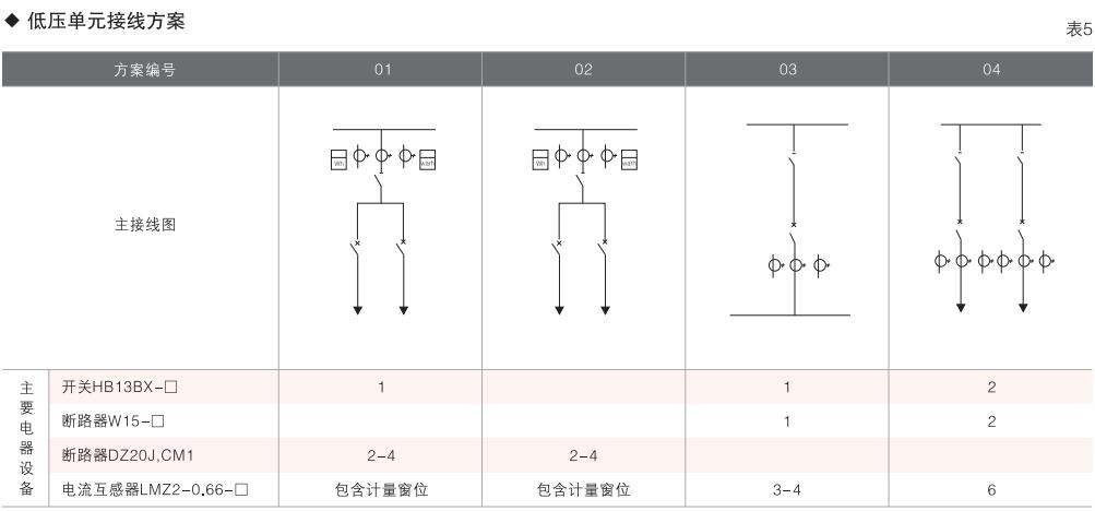 本變電箱高、低壓單元均采用組合式柜.按所需要接線組合成高、低壓配電系統(tǒng)常用高、低壓柜的接線方案均可選用,同時高壓單元又可組合成環(huán)網型式等。(見表4、表5)