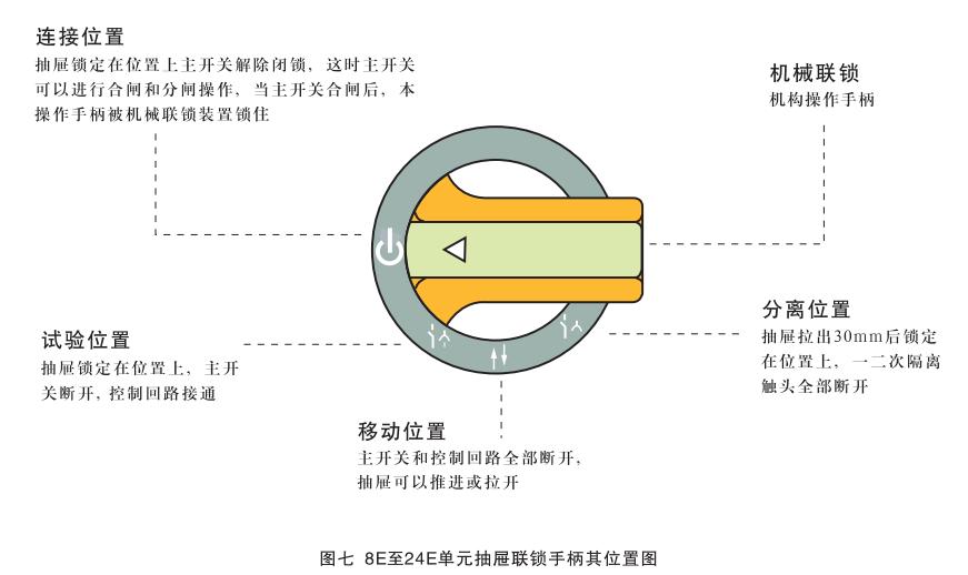 8E/4, 8E/2單元抽屜的操作:這種操作是通過對抽屜面板上的手柄進(jìn)行操作實(shí)現(xiàn)的,見圖六。只有當(dāng)手柄上的白箭頭指示“移動位置”(↑↓)時,抽屜方可抽出或插入,在其它任何位置上,抽屜都應(yīng)被鎖定,因此不可能對抽屜實(shí)施抽出或插入操作。此時不可硬拉或硬拖以免損壞機(jī)械聯(lián)鎖機(jī)構(gòu),抽屜從連接位置抽出30mm(此時手中工件一輕微震頗感)時將操作手柄向逆時針方向轉(zhuǎn)過45°,抽屜即被鎖定在“分離位置”(↑↓)此時一次和二次隔離插件均己脫離電網(wǎng)并形成安全間隔。